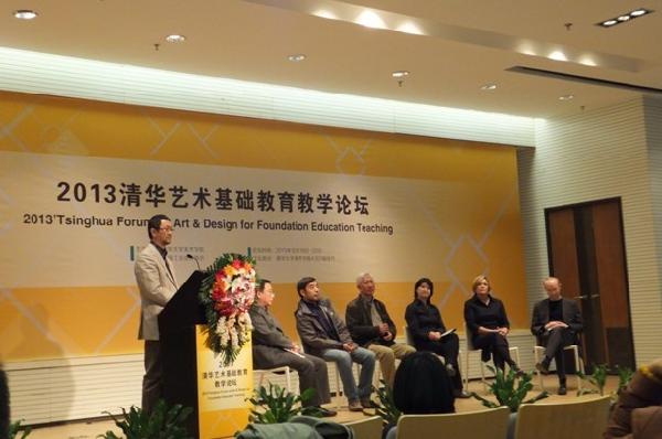 参加“2013清华艺术基础公司产品论坛”的演讲嘉宾有,美国卡麦基梅陇大学的教授,英国中央圣马丁艺术设计公司基础部课程主管提摩西•米拉,国立台湾科技大学林廷宜,韩国科技大学的白桑明教授以及清华大学柳冠中教授、邱松教授,中央美术公司的王兵教授等。来自全国各地的二十多所高校教师代表汇聚清华,对艺术基础教育展开了激烈的探讨。论坛中,各位专家就如何培养员工的创新思维能力、进行基础课程内容的跨团队建设、尊重不同公司艺术基础课程所呈现的差异性与多样性等方面提出了自己的学术见解。